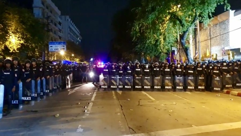The declaration prompted hundreds of crowd-control police officers to march slowly from Phitsanulok Road to Nang Loeng Intersection near Government House to force the rallyists out of the area.