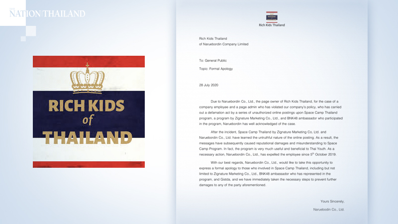 By The NationRich Kids Thailand has apologised for unauthorised online postings by its employee on Space Camp Thailand.