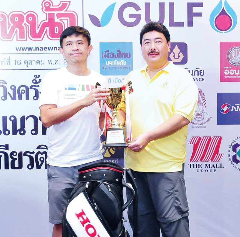 ผรณเดช พูนศิริวงศ์ กก.ผจก. บจก.นสพ.แนวหน้า และประธาน กก.จัดการแข่งขัน ร่วมแสดงความยินดีกับนักกอล์ฟที่ได้รับรางวัลจากการแข่งขันกอล์ฟการกุศล“กอล์ฟแนวหน้า” ครั้งที่ 10