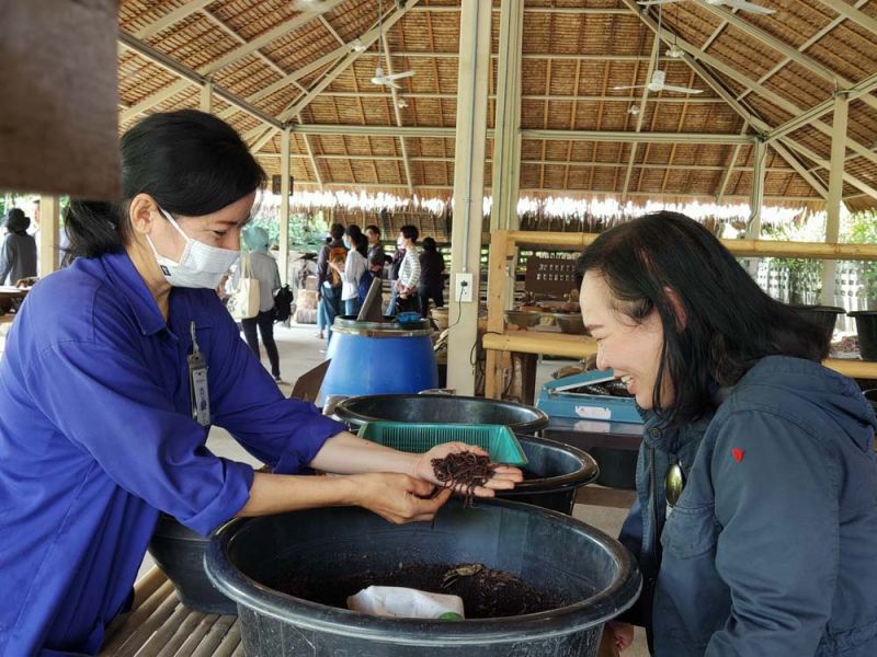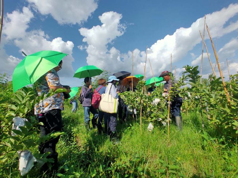 และอีกหนึ่งไฮไลท์ของทริปนี้ คือ ทุกคนได้ไปลงพื้นที่สัมผัสท่องเที่ยวฟาร์มจริงที่ ไร่อาปื๊ดกะโอปอ ต.คลองบางแก้ว อ.นครชัยศรี จ.นครปฐม ที่นี่ได้เรียนรู้การพึ่งพาตนเองและเศรษฐกิจหมุนเวียนตามวิถีเกษตรอินทรีย์ เช่น การทำปุ๋ยพืชสดหมักในถุงไม่กลับกองที่ใช้วัตถุดิบในแปลงมาทำ เทคนิคการตอนกิ่งฝรั่ง การห่อฝรั่ง และชมแปลง พร้อมให้ทุกคนได้ชิมความอร่อยของฝรั่งกิมจูเก็บสดๆ จากต้น