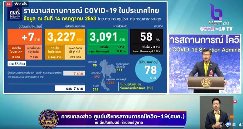 วันที่ 14 กรกฎาคม 2563 ที่ทำเนียบรัฐบาล นายแพทย์ทวีศิลป์ วิษณุโยธิน โฆษกศูนย์บริหารสถานการณ์การแพร่ระบาดของโรคติดเชื้อไวรัสโคโรน่า 2019 (ศบค.) แถลงสถานการณ์แพร่ระบาดของโรคโควิด-19 ประจำวัน ว่า ประเทศไทย พบจำนวนผู้ติดเชื้อรายใหม่เพิ่ม 7 ราย ซึ่งเป็นผู้ที่เดินทางกลับจากต่างประเทศที่พักอยู่ใน State Quarantine หายป่วยแล้ว 3,091 ราย ผู้ป่วยยืนยันสะสม 3,227 ราย ผู้ป่วยรักษาอยู่ 78 ราย เสียชีวิตสะสม 58 ราย