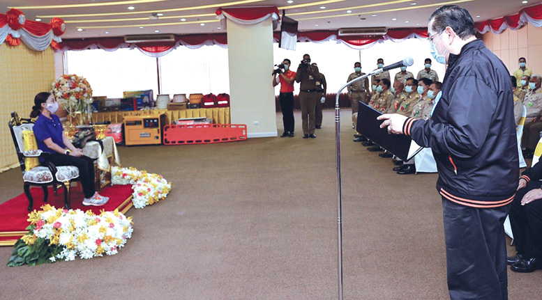 พระราชทานฉายพระรูปร่วมกับคณะกรรมการมูลนิธิอาสาเพื่อนพึ่ง (ภาฯ) ยามยาก สภากาชาดไทย ผู้แทนเครือข่ายเตือนภัยพิบัติชุมชนเพื่อนพึ่ง (ภาฯ) คณะผู้บริหารและเจ้าหน้าที่ศูนย์อำนวยการบริหารจังหวัดชายแดนภาคใต้