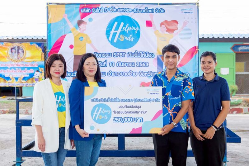 สำหรับกิจกรรม “Helping Hands” ในปีนี้ คือกิจกรรม “เติมยิ้มให้น้อง” ซึ่งพนักงานจิตอาสาได้ร่วมกันปรับปรุงสภาพระเบียงอาคารเรียนที่ทรุดโทรมด้วยการทาสีใหม่ มอบอุปกรณ์การเรียนให้กับเด็กนักเรียน เลี้ยงอาหารกลางวัน จัดกิจกรรมนันทนาการสร้างรอยยิ้ม พร้อมทั้งมอบเงินทุน 250,000 บาท ซึ่งพนักงานของ ซันโทรี่ เป๊ปซี่โค ได้ร่วมระดมทุนผ่านกิจกรรม “Bring & Buy” จากการออกบูธขายของ การประมูลสินค้า และขายสลากชิงโชค กิจกรรมเหล่านี้เป็นตัวอย่างแสดงถึงความมุ่งมั่นของ ซันโทรี่ เป๊ปซี่โค ที่ตั้งเป้าในการดำเนินธุรกิจควบคู่กับการส่งเสริมวัฒนธรรมในองค์กรให้พนักงานตระหนักถึงบทบาทและความรับผิดชอบที่มีต่อสังคม