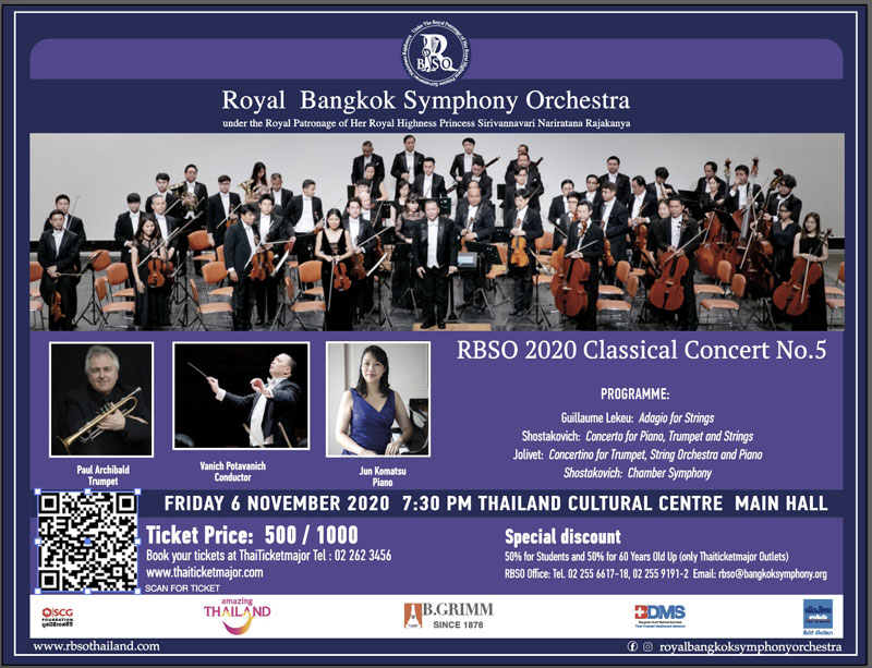 มูลนิธิรอยัลแบงค์คอกซิมโฟนีออร์เคสตร้า ในพระอุปถัมภ์สมเด็จพระเจ้าลูกเธอ เจ้าฟ้าสิริวัณณวรี นารีรัตนราชกัญญา และการท่องเที่ยวแห่งประเทศไทย โดยความสนับสนุนของบี.กริม, BDMS,เมืองไทยประกันภัย และมูลนิธิเอสซีจี รายการ “RBSO 2020 Classical Concert ครั้งที่ 5” บรรเลงโดยวงรอยัล แบงค์คอกซิมโฟนีออร์เคสตร้า ร่วมด้วยสองศิลปินเดี่ยวรับเชิญชื่อดังคือ จุน โคมัทสึ (Jun Komatsu)นักเปียโนชาวญี่ปุ่น และพอล อาร์ชิบอลด์ (Paul Archibald) นักทรัมเป็ตชาวอังกฤษ อำนวยเพลงโดย วานิช โปตะวนิช ศิลปินศิลปาธร และผู้อำนวยเพลงประจำวง RBSO