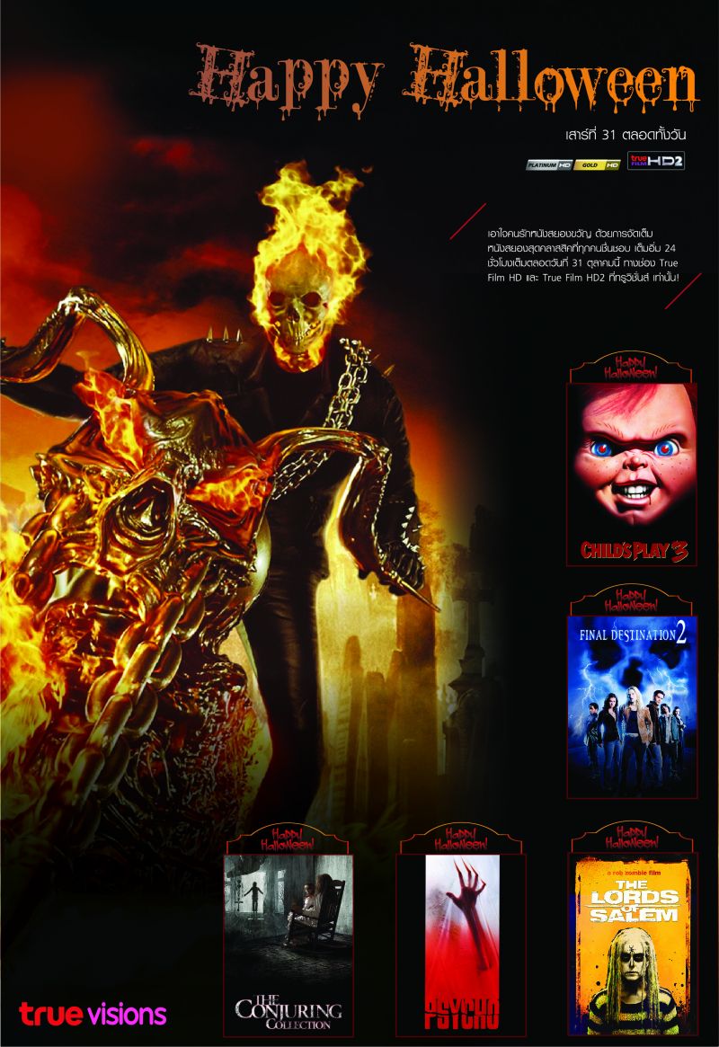 รับเทศกาลฮาโลวีนอย่างเต็มที่สำหรับ “ทรูวิชั่นส์” ที่คัดเลือกหนังสยองขวัญมาให้แฟน ๆ ทุกคนได้ลุ้นระทึกตลอด 24 ชั่วโมง ทาง True Film HD ช่อง 222 และ True Film HD2 ช่อง 223 ตลอดวันที่ 31 ตุลาคมนี้ เรียกได้ว่าโดนใจคอหนังสยองขวัญอย่างแน่นอน ไม่ว่าจะเป็น “Child’s Play 3”(แค้นฝังหุ่น 3) ภาพยนตร์แอคชั่นสยองขวัญกับตุ๊กตานักเชือดระดับตำนาน หรือที่ทุกคนรู้จัก ชัคกี้, Final Destination 2 (โกงความตายแล้วต้องตาย) ผู้รอดชีวิตจากเที่ยวบิน 180 ที่ยังมีชีวิตอยู่จากภาคที่แล้ว กำลังพบกับความตายที่จะมาเอาชีวิตของเธอ เหมือนกับเพื่อนๆของเธอทุกคน ซึ่งเธอต้องทำทุกอย่างแข่งกับเวลา พร้อมกับความกลัว และความตื่นเต้น เพื่อที่จะมีชีวิตรอด “Psycho” (ไซโค), หนังแนวระทึกขวัญ สยองขวัญในยุค 60 สร้างความกดดันให้กับคนดูพร้อมไปกับตัวละครได้อย่างเข้มข้น “The Conjuring 3” (คนเรียกผี) เรื่องราวอันน่าสลดใจในความหว าดกลัว การฆาตกรรม และความชั่วร้าย ที่พร้อมจะสร้างความหวาดผวา ให้กับผู้ชมทุกคน ฯลฯ