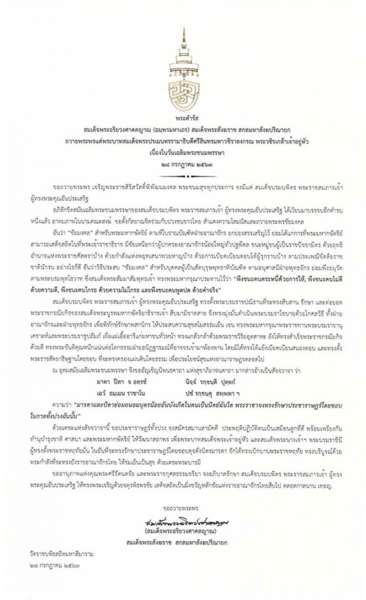 เมื่อวันที่ 27 กรกฎาคม 2563 เนื่องในวันเฉลิมพระชนมพรรษา พระบาทสมเด็จพระเจ้าอยู่หัว ๒๘ กรกฎาคม ๒๕๖๓ เจ้าพระคุณ สมเด็จพระอริยวงศาคตญาณ สมเด็จพระสังฆราช สกลมหาสังฆปริณายก มีพระดำรัสถวายพระพร ความว่า