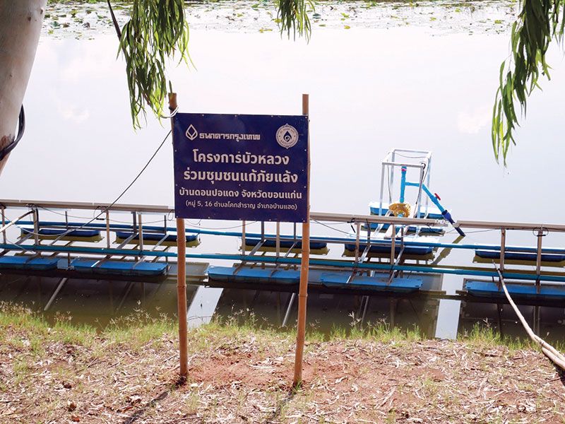 ดร.ทวีลาภ ฤทธาภิรมย์ กรรมการผู้ช่วยผู้จัดการใหญ่ ธนาคารกรุงเทพ กล่าวถึงความคืบหน้าโครงการบัวหลวงร่วมชุมชนแก้ภัยแล้งในพื้นที่จังหวัดขอนแก่น ว่า “ทางโครงการให้ความช่วยเหลือบริหารจัดการน้ำรวม 9 ชุมชน3 อำเภอ ประกอบด้วย ชุมชนบ้านโคกสำราญบ้านดอนปอแดง อ.บ้านแฮด, ชุมชนบ้านธาตุ บ้านชีกกค้อ บ้านหนองนางขวัญ อ.บ้านไผ่, ชุมชนบ้านหนองหวาย บ้านกุดหล่ม หมู่ 2, 3, 6, 7บ้านกุดหล่ม หมู่ 8 และบ้านดอนดู่ อ.ชนบทโดยวางแนวทางแก้ไขตามสภาพปัญหาและลักษณะของพื้นที่ ทั้งการขุดลอกร่องระบายน้ำจากแหล่งน้ำต้นทุน การขุดบ่อพักเพื่อกระจายน้ำเข้าในระบบ รวมทั้งสร้างระบบส่งน้ำด้วยไฟฟ้าจากแสงอาทิตย์ ซึ่งทุกพื้นที่สามารถดำเนินการได้ตามเป้าหมายอย่างครบถ้วนแล้ว