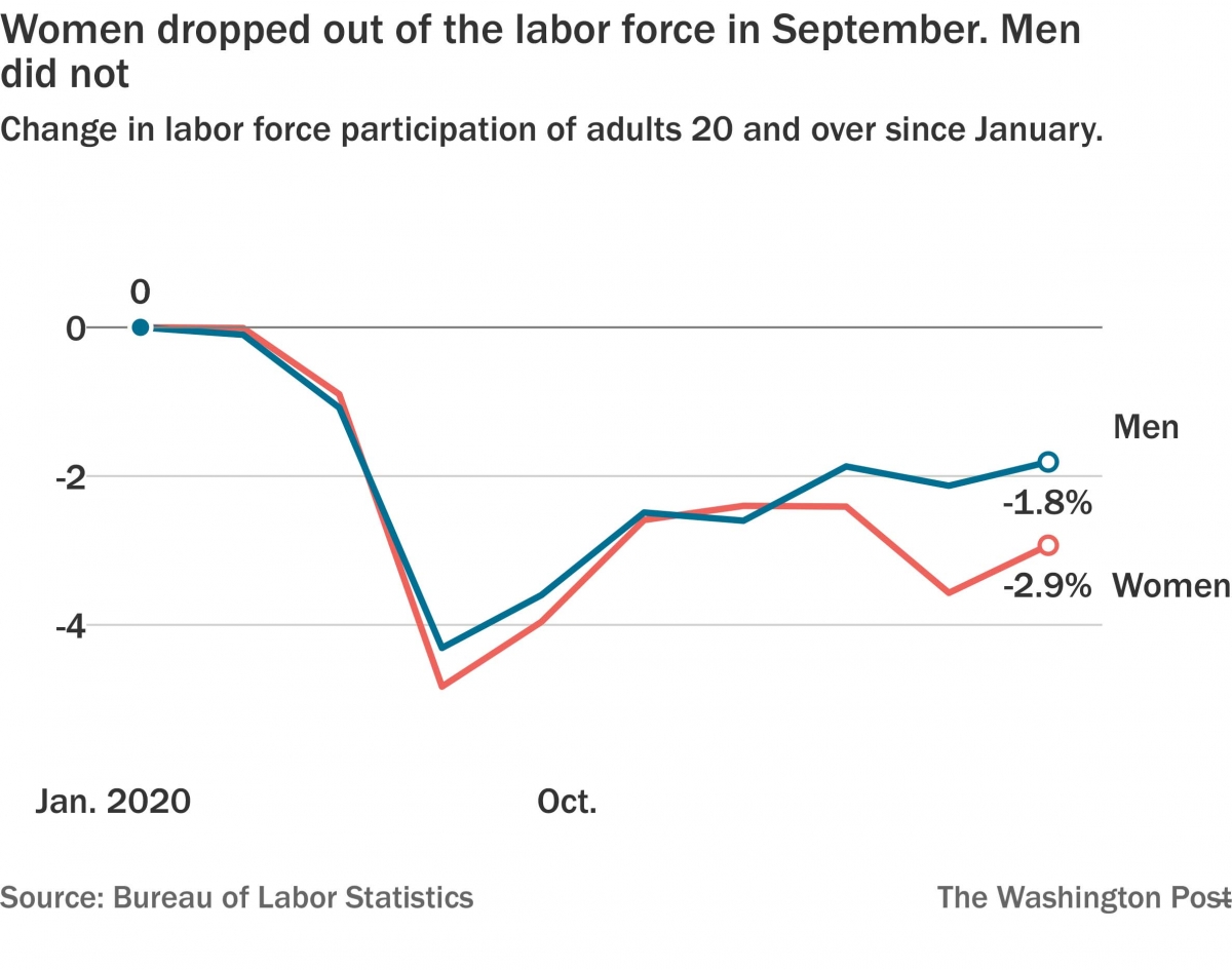 “Fifty-nine percent of women’s job gains in October came from leisure and hospitality. Will those gains hold if covid cases stay high this winter?” said Michael Madowitz, an economist at the left leaning Center for American Progress who has been tracking women’s labor force participation closely.