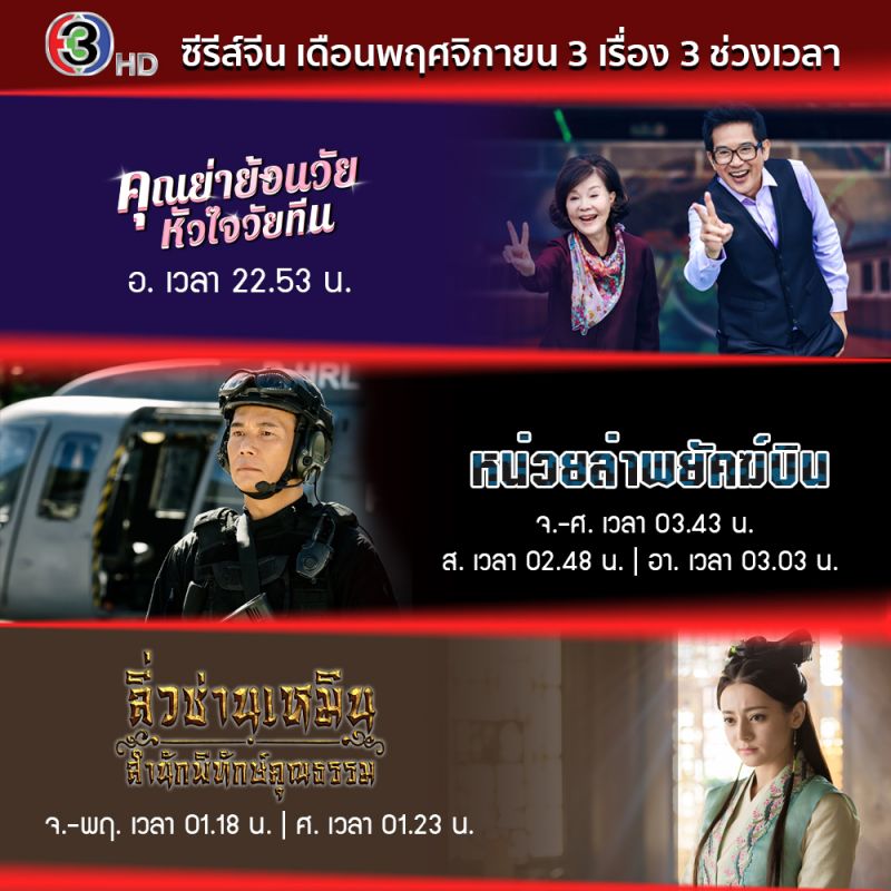 ก้าวเข้าเดือนพฤศจิกายน ช่อง 3 ก็ยังคงเดินหน้ามอบความสุขให้ผู้ชมอย่างต่อเนื่องด้วยแพ็คซีรีส์รอบดึก 3 เรื่อง 3 รส ครบทุกแนวตำนานที่ยังคงตราตรึง สำหรับใครที่ชอบซีรีส์จีนสนุกๆ ดูแล้วได้แง่คิด พลาดไม่ได้เด็ดขาด!การันตีด้วยเนื้อเรื่อง และเหล่านักแสดงที่ท่านไม่อาจลืมถือว่าสมการรอคอยในการรับชมอย่างแน่อนชนิดที่ว่าไม่ต้องกดเปลี่ยนช่องไปไหนเลยทีเดียว