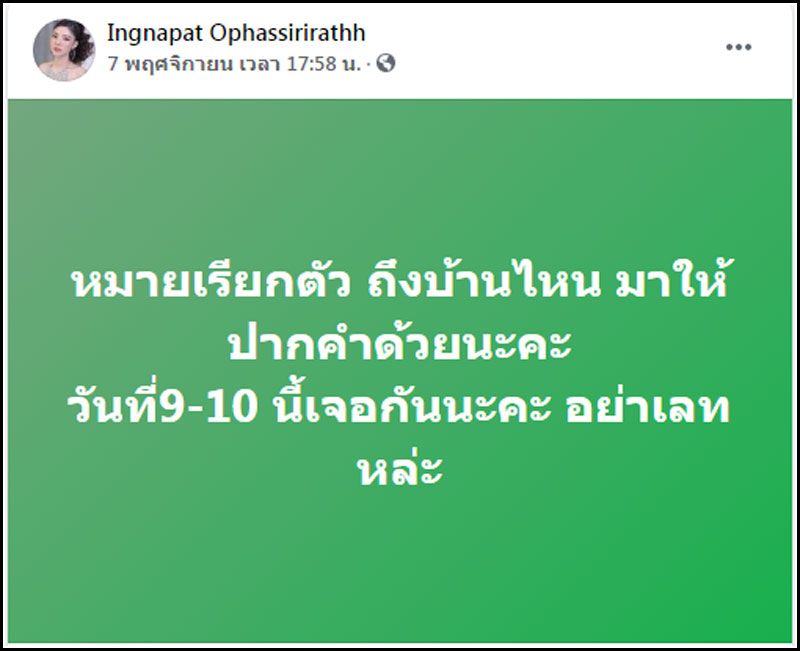 โดยล่าสุด น้องอิงอิง ได้ออกมาโพสต์เตือนผ่านเฟซบุ๊กอีกครั้ง โดยระบุว่า “หมายเรียกตัว ถึงบ้านไหน มาให้ปากคำด้วยนะคะ วันที่ 9-10 นี้เจอกันนะคะ อย่าเลตล่ะ”