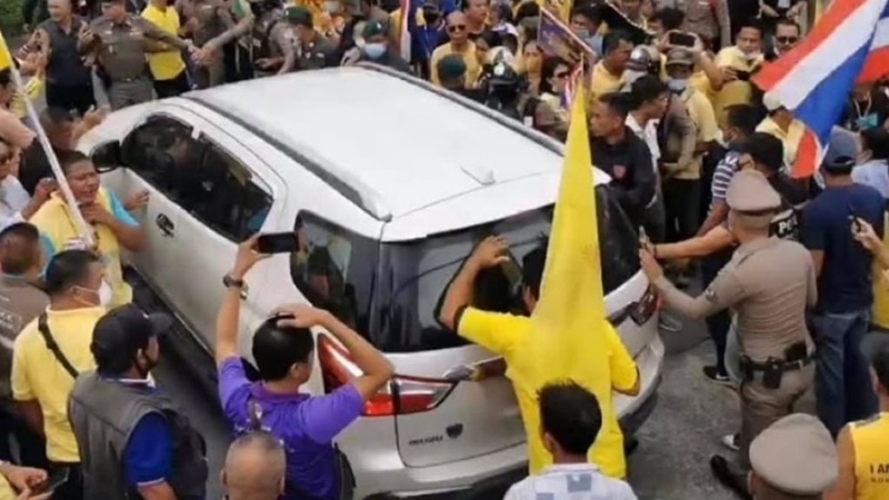 The royalist protesters mobbed the car and shouted for Thanathorn to “get out of Thailand”, accusing him of seeking to topple the monarchy.
