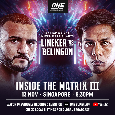 ONE Championship returns with ONE: INSIDE THE MATRIX III, a previously-recorded event at the Singapore Indoor Stadium in Singapore for global broadcast this Friday night, 13 November. Belingon and Lineker compete in the main event, but the Team Lakay veteran will be joined by his teammates Geje Eustaquio and Lito Adiwang who will be competing on the same card.