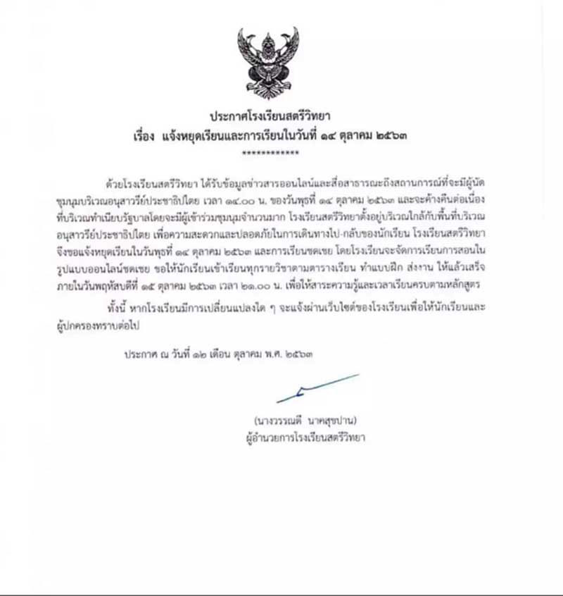 หนีม็อบ! รร.สตรีวิทยาประกาศหยุดการเรียนการสอน เลี่ยงชุมนุม 14 ตุลาฯ