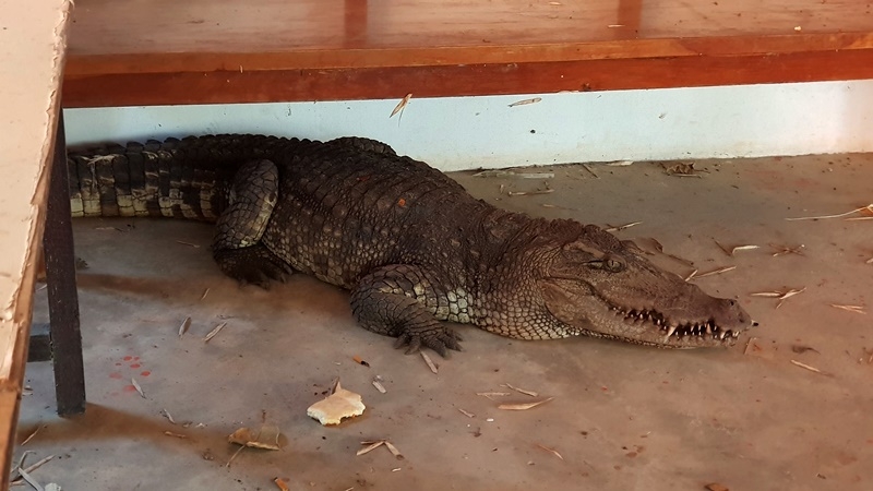 A pet crocodile of a monk in Chaiyaphum province escaped from a pond and entered a temple pavilion, scaring people who had gathered there.
