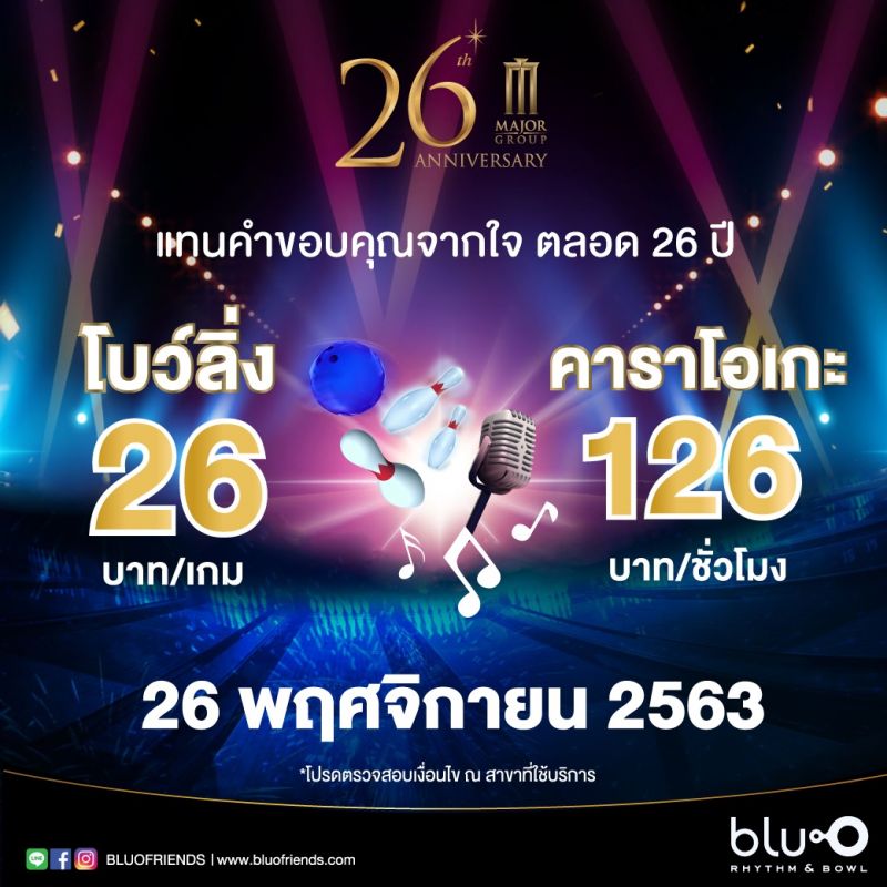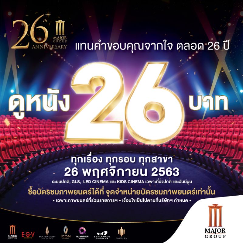 เมเจอร์ ซีนีเพล็กซ์ กรุ้ปเติบโตก้าวสู่ปีที่26ในวันที่ 26 พฤศจิกายนนี้ จัดแคมเปญพิเศษเพื่อตอบแทนและขอบคุณลูกค้าด้วยการมอบของขวัญพิเศษด้วยการเปิดโรงภาพยนตร์ทุกสาขาทั่วประเทศให้ลูกค้าได้ดูหนังราคาพิเศษเพียง 26 บาท สำหรับที่นั่งปกติและที่นั่งฮันนีมูนในระบบปกติ,โรงภาพยนตร์ GLS (Giant Laser Screen), LED Cinemaและ Kids Cinema ดูได้ทุกเรื่อง ทุกรอบที่ร่วมรายการ ตลอดวันที่ 26 พฤศจิกายนนี้โดยไม่จำกัดจำนวนสิทธิ์ลูกค้าสามารถซื้อตั๋วดูหนังได้ที่จุดจำหน่ายตั๋วหนัง บ็อกซ์ออฟฟิศ สามารถดูรายละเอียดและเช็ครอบฉายได้ที่www.majorcineplex.com และ App Major Cineplex