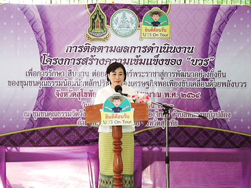 คุณยุพา ทวีวัฒนะกิจบวร ยังบอกด้วยว่า ในจังหวัดสุโขทัยนี้มีชุมชนคุณธรรมน้อมนำหลักปรัชญาของเศรษฐกิจพอเพียง ขับเคลื่อนด้วยพลังบวร 644 แห่ง ประกอบด้วย ชุมชนระดับส่งเสริมคุณธรรม 217 แห่ง ระดับคุณธรรม 339 แห่ง ระดับต้นแบบ 108 แห่ง และเป็นชุมชนคุณธรรมต้นแบบ “บวร On Tour” 20 แห่งซึ่งได้รับการส่งเสริม สนับสนุน การดำเนินโครงการและกิจกรรมจากกระทรวงวัฒนธรรม (วธ.) ตามที่รัฐบาลได้มอบหมายให้เป็นหน่วยงานหลักร่วมกับหน่วยงานที่เกี่ยวข้องนำหลักการ “บวร : บ้าน วัด โรงเรียน” ไปขับเคลื่อนและดำเนินกิจกรรมต่างๆ เพื่อให้ประชาชนเข้าใจ และเข้าถึงโครงการต่างๆ ได้อย่างรวดเร็ว ทั่วถึงและเท่าเทียมกัน