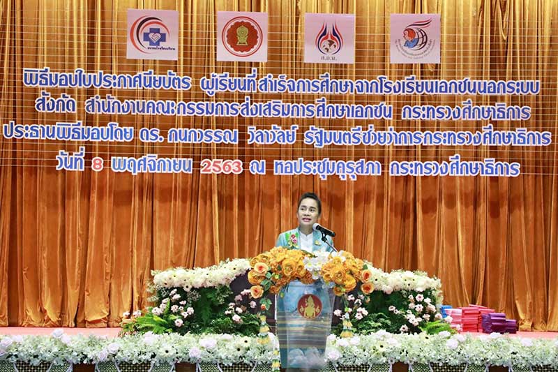 8 พฤศจิกายน 2563 นางกนกวรรณ วิลาวัลย์ รัฐมนตรีช่วยว่าการกระทรวงศึกษาธิการ(รมช.ศธ.) พร้อมด้วย นายธฤติ ประสานสอน รองเลขาธิการ กช. เดินทางเป็นประธานมอบใบประกาศนียบัตร โรงเรียนเอกชนนอกระบบ เครือข่ายสมาคมการศึกษาเอกชนนอกระบบ (ประเทศไทย) โดยมีโรงเรียนเข้าร่วม 35 โรงเรียน และมีผู้สำเร็จการศึกษา ทั้งสิ้น 1,000 คน มีนายพรชัย พิศาลสิษฐ์กุล นายกสมาคมการศึกษาเอกชนนอกระบบ (ประเทศไทย) คณะกรรมการ ผู้บริหาร ครูผู้สอน และผู้เรียนที่สำเร็จการศึกษาให้การต้อนรับที่หอประชุมคุรุสภา กระทรวงศึกษาธิการ