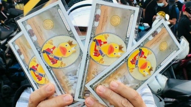 Srisuwan also said the banknotes feature a picture of the Democracy Monument, fried meatballs, a white pigeon, Ratsadon’s 2020 coup memorial plaque and inflatable rubber ducks with a value equal to Bt10.