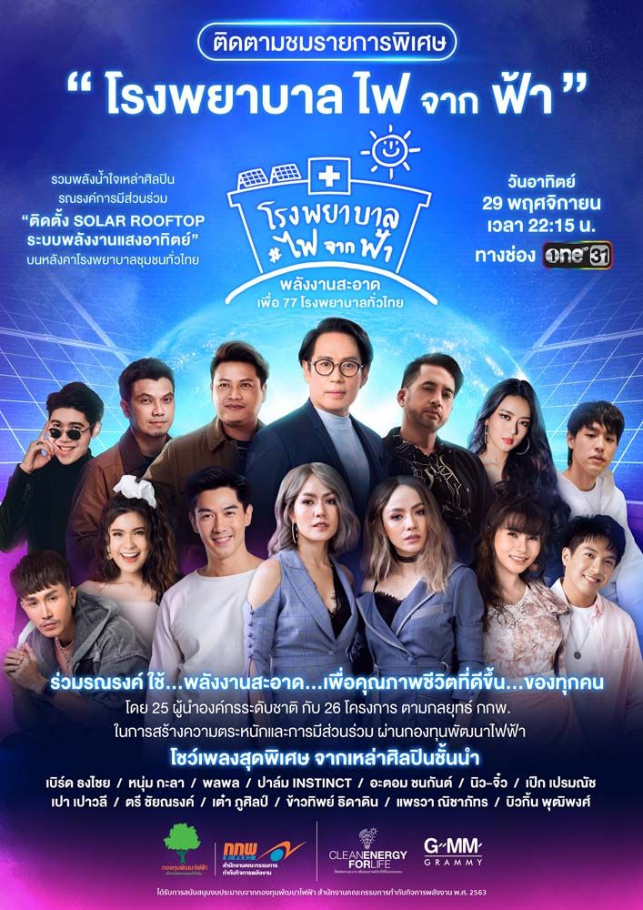 บริษัท จีเอ็มเอ็มแกรมมี่ จำกัด (มหาชน) ในฐานะผู้ได้รับการสนับสนุนงบประมาณจากกองทุนพัฒนาไฟฟ้า สำนักงานคณะกรรมการกำกับกิจการพลังงานพ.ศ.2563 จัดกิจกรรมส่งเสริมการมีส่วนร่วม โดยร่วมกับกระทรวงสาธารณสุข และกรุงเทพมหานคร จัดโครงการ“โรงพยาบาล ไฟ จาก ฟ้า” พลังงานสะอาดเพื่อ 77 โรงพยาบาลทั่วไทย ซึ่งเริ่มจากการให้ความรู้ ความเข้าใจ ผ่านกิจกรรมประชาสัมพันธ์ในสื่อต่างๆที่ครอบคลุมโดยมี “เบิร์ด-ธงไชย แมคอินไตย์” เป็น KOL : KEY OPINION LEADER หรือเป็นตัวแทนหลักของโครงการฯ เป็นผู้สื่อสารเรื่องพลังงานสะอาดโดยจะสื่อสารถึงประโยชน์ของการใช้พลังงานสะอาดเพื่อชีวิตที่ดีขึ้นในหลายๆ ด้าน สื่อสารผ่านเพลงประจำโครงการฯคือ เพลง “ให้โลกได้เห็น (น้ำใจคนไทย)”ร่วมกับศิลปินแกรมมี่ รวมถึงจัดกิจกรรม GMM BEST SINGER LIVE FROM HOME จากศิลปินแกรมมี่ ได้แก่ พลพลพลกองเส็ง, หนุ่ม กะลา, เปาวลี-พรพิมล, เต๋า-ภูศิลป์, ตรี ชัยณรงค์, ข้าวทิพย์ ธิดาดิน,ปาล์ม, อะตอม-ชนกันต์, นิว-จิ๋ว, เป๊ก-เปรมณัช,บิวกิ้น และแพรวา เป็นการสื่อสารเพื่อการมีส่วนร่วมในการติดตั้ง SOLAR ROOFTOP โรงพยาบาลชุมชน 77 แห่ง
