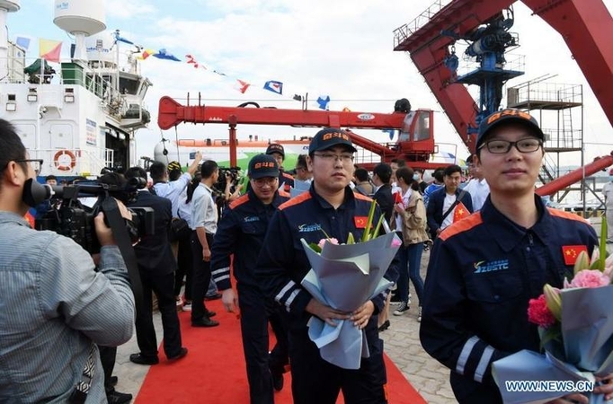 SANYA – China’s new deep-sea manned submersible Fendouzhe (Striver) returned to south China’s Hainan province on Saturday morning onboard the scientific research ship Tansuo-1, after completing its ocean expedition.