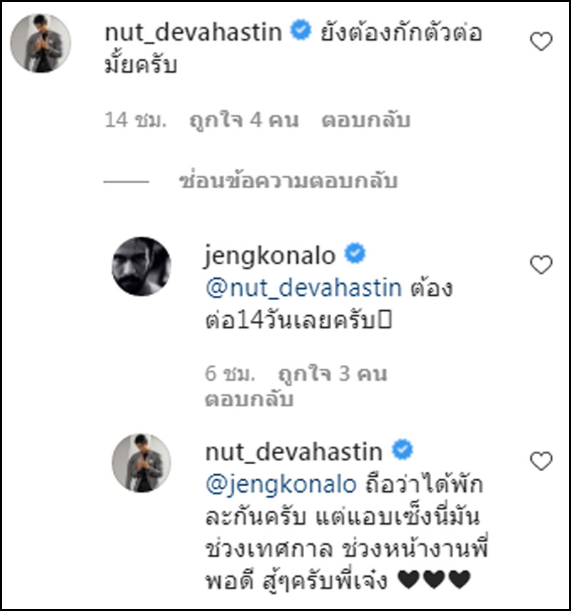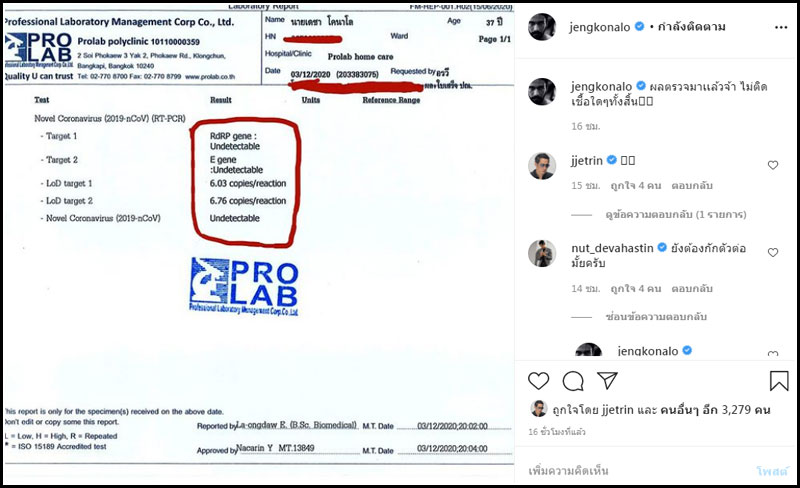 ล่าสุด ผลตรวจออกแล้ว เจ๋ง ระบุว่า “ไม่ติดเชื้อใดๆทั้งสิ้น” แต่ทั้งนี้ก็ยังต้องกักตัวให้ครบถึง 14 วัน เพื่อความมั่นใจและเพื่อครบระยะเวลาตามมาตรการการป้องกันโรคโควิด-19 ต่อไป