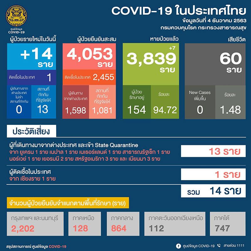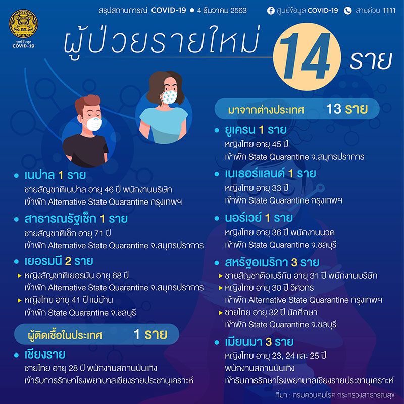 วันที่ 4 ธันวาคม 2563 เวลา 11.00 น. ศูนย์บริหารสถานการณ์การแพร่ระบาดของโรคติดเชื้อไวรัสโคโรนา 2019 (โควิด-19) หรือ ศบค. รายงานสถานการณ์ประจำวัน ว่า พบผู้ติดเชื้อรายใหม่เพิ่ม 14 ราย โดยเป็นผู้ที่เดินทางมาจากต่างประเทศ และเข้าพักในสถานกักกัน State Quarantine ประกอบด้วย ผู้ที่เดินทางมาจาก ยูเครน 1 ราย เนปาล 1 ราย เนเธอร์แลนด์ 1 ราย สาธารณรัฐเช็ก 1 ราย นอร์เวย์ 1 ราย เยอรมนี 2 ราย สหรัฐอเมริกา 3 ราย และเมียนมา 3 ราย
