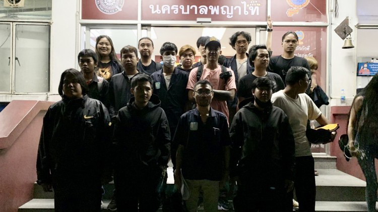 Pro-democracy guards going by the name “We Volunteer” (WEV) were arrested on Monday and charged withviolating officials’ order, after trying to remove barbed tapes and barriers the police had left at the Uruphong intersection in Bangkok since October 21.The WEVO posted on Monday that they would remove the barbed tapes from the intersection, since they obstructed people’s movement.The operation was scheduled to run from 9pm and the WEVO guards arrived punctually at the intersection.The WEVO guards at first contacted officials for removing the tapes and barriers. However, no official appeared within 30 minutes so the WEVO started their own operation at around 9.45pm.Metropolitan Police deputy chief Attawit Saisueb and his subordinates later arrived at the scene, asking the WEVO to stop removing the things. Piyarat Chongthep, the WEVO leader, insisted on continuing their operation.Around 11am, 18 guards were taken to Phya Thai Police Station. Piyarat reported via his social media that two WEVO guards among 18 were punched and kicked by the police.After their arrests were announced, some pro-democracy people gathered at the station.At 1.17am on Tuesday, police informed that the WEVO guards would be interrogated and released.At 5.30am, Piyarat and others came out of the station. He told the press that all guards were charged with violation of official orders and illegal gathering. The WEVO guards denied all charges and were scheduled to meet the interrogators again on December 28.