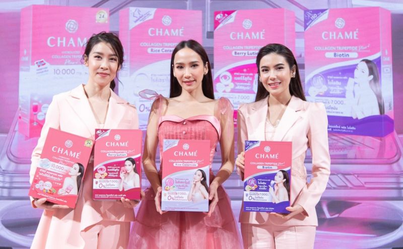 ล่าสุด‘ชาเม่’ ได้เปิดตัว ‘ชาเม่คอลลาเจนไตรเปปไทด์พลัส’ สูตรที่เปิดตัวไปเมื่อปีที่แล้วคือ ‘ชาเม่คอลลาเจนพลัส 10,000 มก’. เป็นสูตรผิวอ่อนเยาว์ ส่วน 3 สูตรใหม่ในวันนี้คือ ‘ชาเม่คอลลาเจนพลัส ไรซ์เซราไมด์’สูตรสร้างปรากฏการผิวสวยสตรองใสไร้สิว ,‘ชาเม่คอลลาเจนพลัส ไบโอติน’ สูตรเพื่อบำรุงเส้นผม สภาวะไหนก็มั่นใจ และ สูตรสุดท้ายคือ ‘ชาเม่คอลลาเจนพลัส เบอร์รี่ลูทีน’ สูตรเพื่อการบำรุงดวงตาให้สดใส ได้ทุกวัน