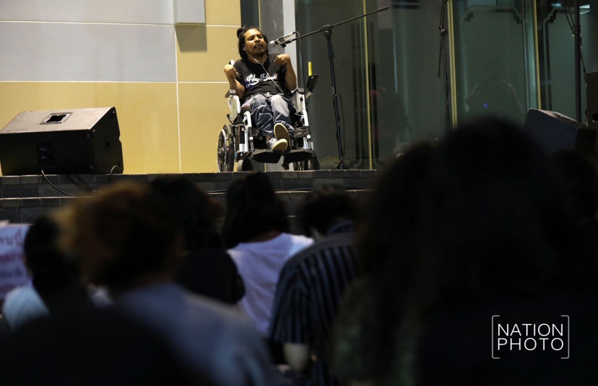 On stage, protesters took turns to discuss rights and liberty, state welfare, and public facilities that fail to meet the needs of disabled people.