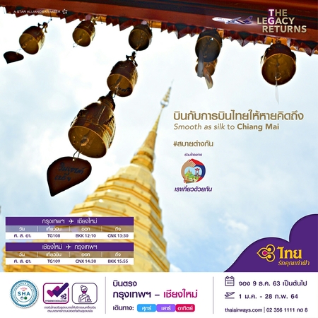 Flight TG108 will depart Suvarnabhumi Airport at 12.10pm and arrive in Chiang Mai at 1.30pm, while TG109 will depart Chiang Mai at 2.30pm and arrive at Suvarnabhumi at 3.55pm.