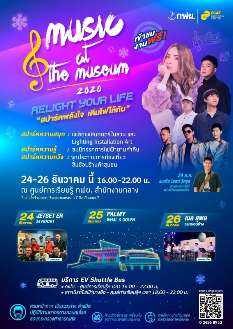 การไฟฟ้าฝ่ายผลิตแห่งประเทศไทย(กฟผ.) ชวนทุกคนมา Relight Your Life สปาร์คพลังใจ เติมไฟให้กัน ในงาน Music at the Museum 2020นิทรรศการไฟยามค่ำคืนและดนตรีในสวน สัมผัสลมหนาวในบรรยากาศริมแม่น้ำเจ้าพระยา ระหว่างวันที่ 24-26 ธันวาคม 2563 เวลา 16.00 – 22.00 น. ณ ศูนย์การเรียนรู้ กฟผ.สำนักงานกลาง จ.นนทบุรี