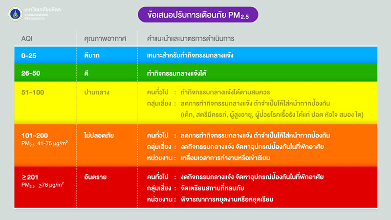 ปัจจุบันประเทศไทยมีความตื่นตัวเรื่อง PM2.5 ในทุกภาคส่วนกันมากขึ้น จำเป็นต้องมีการบูรณาการของทั้งภาครัฐและภาคประชาชนเพื่อหามาตรการควบคุมแหล่งกำเนิด ลดการสูญเสียโดยมีการเฝ้าระวังคุณภาพอากาศพร้อมมีการแจ้งเตือนภัยที่รวดเร็ว รวมถึงปรับค่าเตือนภัยให้เหมาะสมกับกลุ่มคนเปราะบางคือ เด็ก คนท้อง คนชรา และคนมีโรคปอด/หัวใจ/สมอง/ไตเรื้อรัง รณรงค์ให้ประชาชนปรับเปลี่ยนพฤติกรรมกลางแจ้งพร้อมใช้หน้ากากป้องกันฝุ่นอย่างถูกต้องหน่วยงานที่เกี่ยวข้องต้องจัดหาหน้ากากทุกชนิดให้ประชาชนมีใช้อย่างเพียงพอ ผลิตและจัดหาอุปกรณ์ป้องกันในที่พักอาศัยโดยเฉพาะเครื่องฟอกอากาศและแผ่นกรองอากาศที่มีประสิทธิภาพและราคาย่อมเยา รวมถึงจัดหาสถานที่หลบภัยสาธารณะในช่วงอากาศวิกฤติสำหรับประชาชนที่ขาดความพร้อมและมีความจำเป็นต้องทำงานกลางแจ้ง เช่น พนักงานทำความสะอาดถนน หรือผู้ขับขี่ยานพาหนะสาธารณะ ฯลฯ