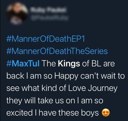 หลังจากที่ “แม็กซ์-ตุลย์” ได้เว้นว่างงานแสดงคู่กันไปนานถึง 2 ปี ก่อนที่จะกลับมาแสดงคู่กันอีกครั้งในบทบาทของ“แทน-บรรณ”เกิดคำถามจากแฟนคลับว่าทั้งคู่จะยังสร้างความตื่นตาตื่นใจได้เหมือนกับผลงานที่ผ่านมาหรือไม่ และสลัดภาพของ”กร-น็อค” ได้หรือเปล่า แต่เมื่อซีรีส์“พฤติการณ์ที่ตายManner Of Death” ออกอากาศไปแค่ตอนแรกก็ได้กระแสตอบรับอย่างล้นหลามทั้งจากแฟนคลับเดิมที่ยังคงเหนียวแน่นและแฟนกลุ่มใหม่ที่โดน 2 หนุ่มตกเข้าอย่างจัง จนทำให้ซีรีส์พฤติการณ์ที่ตาย ติดอันดับเทรนด์ทวิตเตอร์ในชั่วข้ามคืน