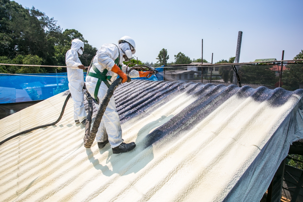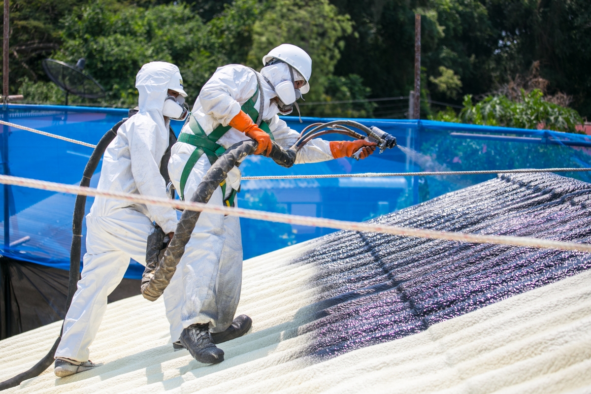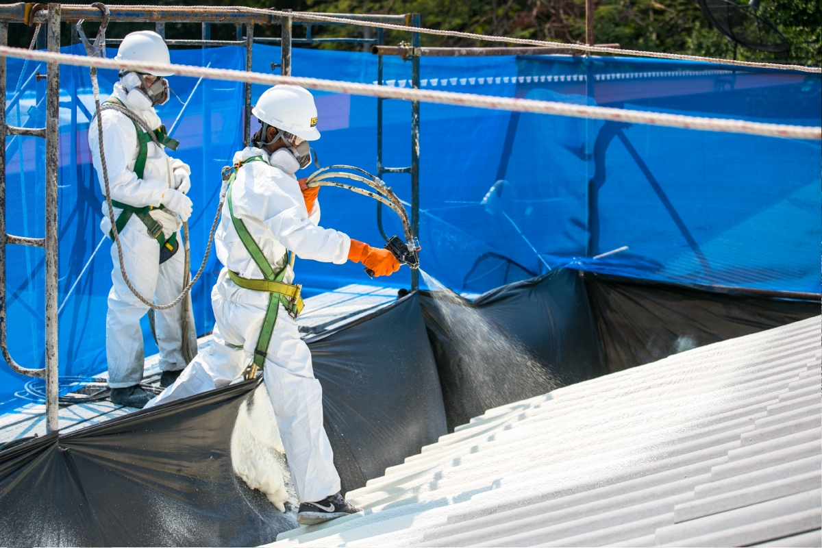 Japanese workers are spraying Toyokoh’s environmental-friendly roof insulation.