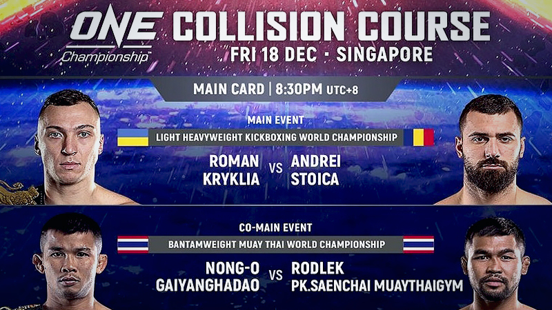 ONE: Collision Course is ONE Championship’s final live event of the year. The stacked card features a main event showdown between ONE light heavyweight kickboxing world champion Roman Kryklia of Ukraine and challenger Andrei “Mister KO” Stoica of Romania.
