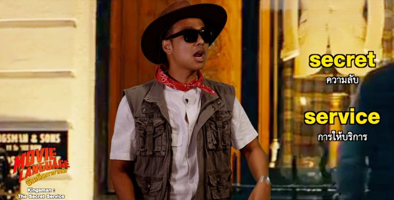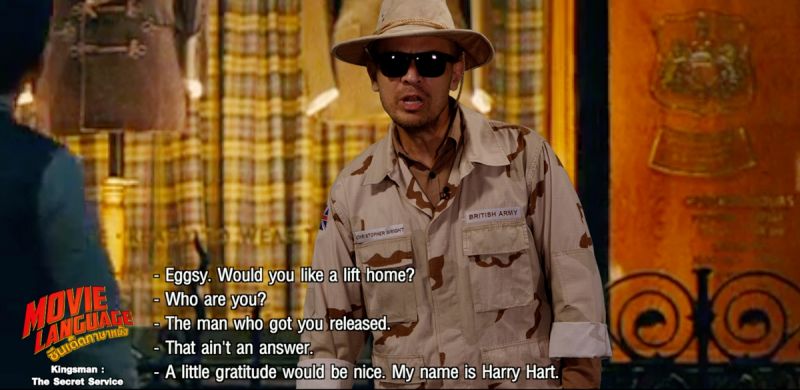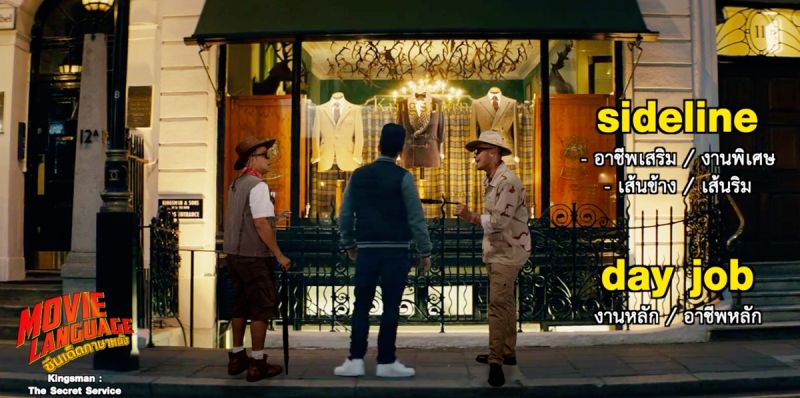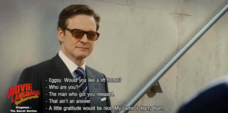 แวะทักทาย พูดคุยกันแบบชิวๆ กันที่ร้านสูตร “คิงส์แมน” สำหรับสองพิธีกร “คริส-เต้” และพระเอกหนุ่มของเรา “เอ็กซี่” นำแสดงโดย “ทารอน เอเจอร์ตัน” ที่ยกคำศัพท์ตัวอย่างในเรื่องขั้นเบสิคแต่ใช้ได้ในแบบแอดแวนซ์ เริ่มที่คำว่า “Sideline” (ไซด์ไลน์) แปลว่า เส้นด้านข้าง , เส้นริม หรือ อาชีพเสริม , งานพิเศษ โดยการใช้งานขึ้นอยู่กับรูปแบบประโยค มักมาควบคู่กับคำว่า “Day job” (เดย์จ็อบ) แปลว่างานประจำหรืองานหลัก ซึ่งไม่ได้แปลว่างานกลางวันหากแปลตรงตัว ด้านประโยคสนทนากมาเต็ม โดยสายลับอาวุโสมากฝีมือ “แฮร์รี่ ฮาร์ท” ฉายา “กาลาฮัด” นำแสดงโดย “โคลิน เฟิร์ธ” กับไดอาล็อคแรกในการพบกันของสองพระเอกประจำเรื่อง โดยมีประโยคที่น่าสนใจ น่าใช้น่าฝึกว่า “Would you like a lift home?” เป็นสำนวนที่ใช้ในการถามว่า “อยากให้ไปส่งที่บ้านไหม?” โดยคำว่า “Lift” (ลิฟต์) คำกริยาจะมีความหมายว่า ชูขึ้น , ยกขึ้น แต่หากอยู่ในรูปแบบของคำนาม จะแปลว่าทับซัพท์ว่า “ลิฟท์” ที่เราใช้ขึ้นลงภายในอาคาร อาจฟังดูซับซ้อนแต่หากรับชมภาพยนตร์และฝึกฝนบ่อยๆ จะคุ้นเคยมากขึ้น