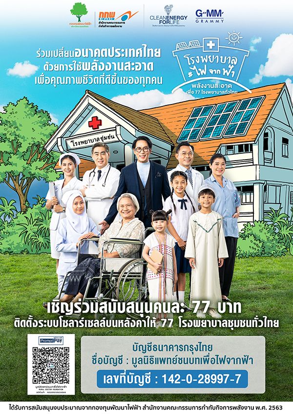 “อยากเชิญชวนทุกคนมาร่วมสร้างความทรงจำดีๆ กับคุณหมอ พยาบาล และอาสาสมัคร ให้ทุกคนได้ใช้พลังงานที่สะอาด ด้วยการร่วมสนับสนุนการติดตั้งระบบโซลาร์เซลล์กับโครงการ “โรงพยาบาล ไฟ จาก ฟ้า” พลังงานสะอาด เพื่อ 77โรงพยาบาลทั่วไทย หากต้องการสนับสนุนโรงพยาบาลที่อยู่ในจังหวัดตนเอง สามารถดูรายละเอียดได้ที่ www.cleanenergyforlife.net ได้เลยครับ”