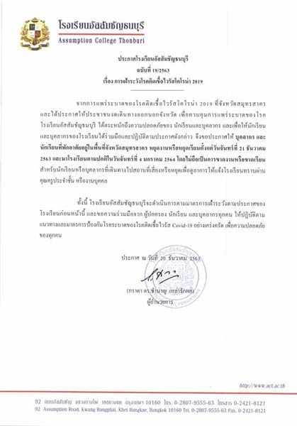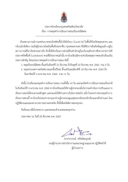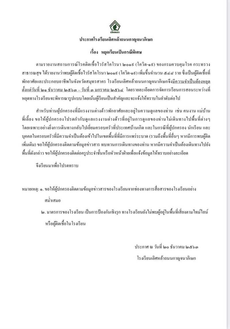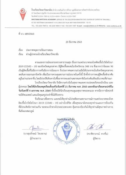 20 ธันวาคม 2563 ผู้สื่อข่าวรายงานว่า บรรดาโรงเรียนต่างๆ ได้ทยอยประกาศปิดการเรียนการสอน ตั้งแต่วันที่ 21 ธันวาคม 2563 ถึงวันที่ 3-4 มกราคม 2564 ภายหลังเกิดการแพร่ระบาดของเชื้อ “โควิด-19” ในหลายพื้นที่ โดยเฉพาะที่ จ.สมุทรสาคร