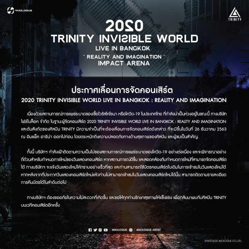 แจ้งเลื่อนคอนเสิร์ต 2020 TRINITY INVISIBLE WORLD LIVE IN BANGKOK : REALITY AND IMAGINATION ที่จะจัดขึ้นในวันที่ 26 ธันวาคมนี้ ณ อิมแพ็ค อารีน่า เมืองทองธานี เนื่องด้วยสถานการณ์การแพร่ระบาดของ COVID-19
