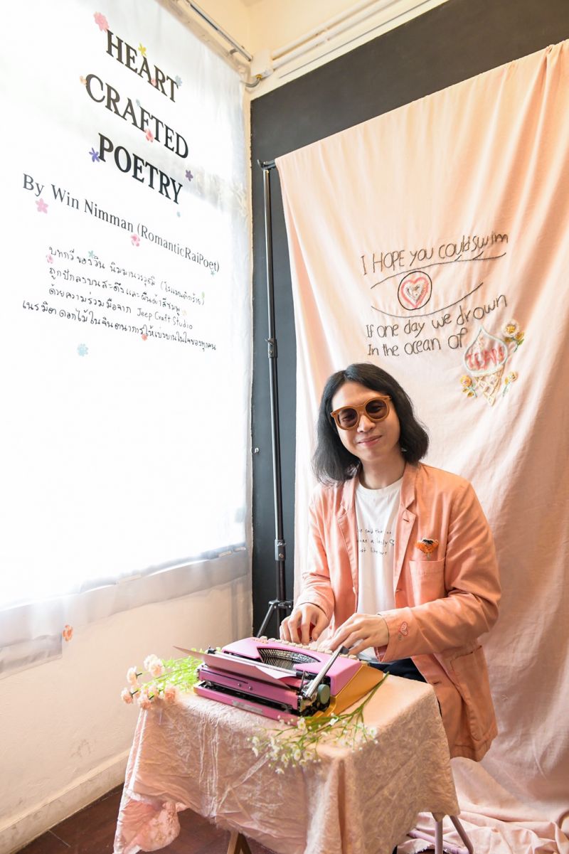 – วิน นิมมานวรวุฒิ(โรแมนติกร้าย) เป็นเฟมินิสต์ กวี และนักร้อง-นักแต่งเพลง ที่ทำงานศิลปะหลากหลายรูปแบบเพื่อสนับสนุนความเท่าเทียมและหลากหลายทางเพศ บทกวีและเพลงของวินเน้นไปที่การให้กำลังใจผู้หญิง นิทรรศการล่าสุดของเขาคือ Miss Candy Heart ที่ผสมผสานระหว่างบทกวี เพลง และภาพวาด ซึ่งใน Hope Factory ครั้งนี้วินร่วมมือกับ Jeep Craft Studio เนรมิตบทกวีสีชมพูในเพจโรแมนติกร้ายให้กลายเป็นงานปักบนผืนผ้าขนาดใหญ่ พร้อมเขียนบทกวีสดให้แก่ผู้เข้าร่วมงานในธีมพิเศษ