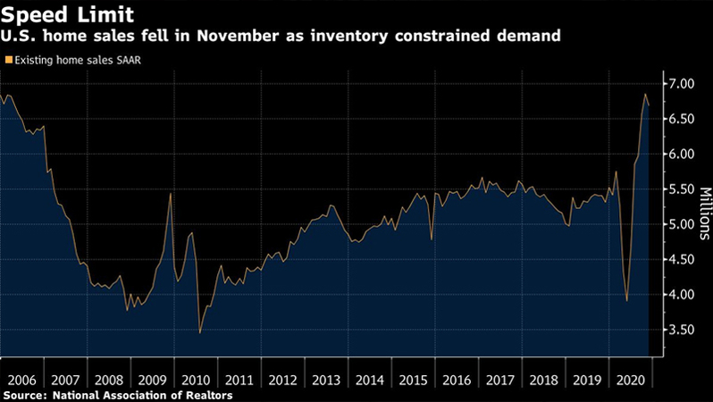 Available inventory declined 22% from a year earlier to 1.28 million units, the lowest in data back to 1982, the NAR said. Properties remained on the market for 21 days in November, unchanged from the prior month and matching a record low. It would take 2.3 months to sell all the homes on the market at the current pace, the lowest on record.