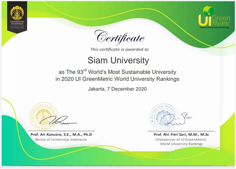 UI GreenMetric World University Rankings จัดทำโดย University of Indonesia (UI) ประเทศอินโดนีเซีย มาเป็นเวลา 10 ปีแล้ว ตั้งแต่ พ.ศ.2553 การจัดอันดับพิจารณาจากโครงสร้างพื้นฐานการจัดการด้านพลังงาน การจัดการของเสีย การจัดการน้ำการเดินทาง และการศึกษาด้านความยั่งยืน โดยในปีนี้มีมหาวิทยาลัยจากทั่วโลกเข้าร่วมการจัดอันดับจำนวน 912 แห่งมหาวิทยาลัยในภูมิภาคเอเชีย 468 แห่ง มหาวิทยาลัยจากประเทศไทย 37 แห่งที่น่ายินดี คือ ในปีนี้มหาวิทยาลัยสยามได้รับการจัดอันดับที่ 1 ของมหาวิทยาลัยไทยถึงสองด้าน คือ การเดินทาง และการศึกษาด้านความยั่งยืน ส่วนในอันดับโลกมหาวิทยาลัยสยามก็ได้รับการจัดอันดับที่ 31ของโลกด้านการเดินทาง และอันดับที่ 28ของโลกด้านการศึกษาเพื่อความยั่งยืนจากมหาวิทยาลัยทั้งหมด912 แห่ง รวมทั้งยังเป็นมหาวิทยาลัยที่ยั่งยืนอันดับที่ 45 ของมหาวิทยาลัยที่ตั้งอยู่ในเขตเมืองทั้งหมด 459 แห่งทั่วโลก