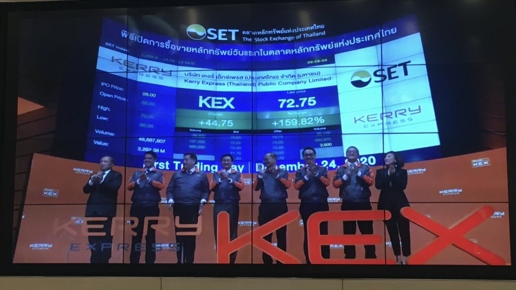 Kerry Express (KEX) began its first day of trading on Thursday with shares going at Bt65 apiece, Bt37 or 132 per cent higher compared to its initial public offering (IPO) price of Bt28 per share.