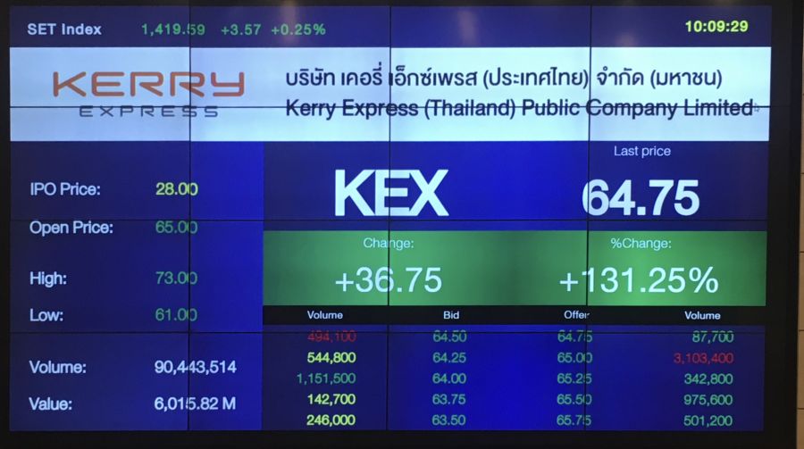 Kerry Express (KEX) began its first day of trading on Thursday with shares going at Bt65 apiece, Bt37 or 132 per cent higher compared to its initial public offering (IPO) price of Bt28 per share.
