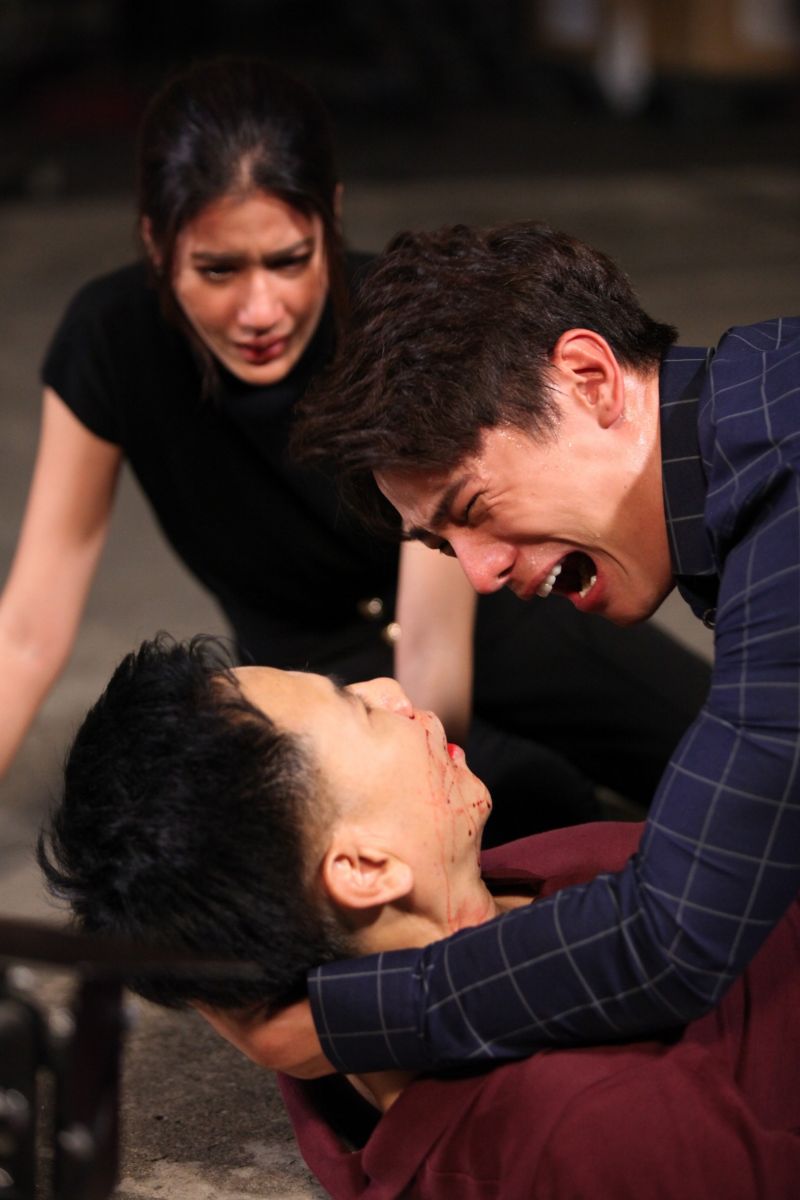 เบื้องหลังฉากนี้ยกกองไปถ่ายทำกันที่โกดังริมแม่น้ำ ระหว่างที่รอพระอาทิตย์ตกดิน พี่ฬอน ผู้กำกับ เรียกทั้ง 4 คนมาซักซ้อมคิว โดยเฉพาะเกรทและอาหมู ที่ต้องบรีฟและติวเข้มเป็นพิเศษ เพราะฉากนี้เป็นฉากที่ปลดปล่อยอารมณ์ความรู้สึกที่เก็บมาทั้งเรื่องของเกรท ซึ่งเกรทจะต้องทำการบ้านอย่างหนัก ยิ่งต้องมาปะทะอารมณ์กับอาหมูเข้าไปอีก ทำเอาเกรทถึงกับประหม่า จนอาหมูต้องเรียกเกรทมาพูดคุย เพื่อให้เกรทผ่อนคลาย แล้วมันก็ได้ผลจริง เกรทหายกังวล ก่อนจะเริ่มถ่ายทำเกรทได้ยกมือขอโทษขอโพยอาหมูไว้ล่วงหน้า ซึ่งอาหมูก็โชว์สปิริตนักแสดงรุ่นเก๋าบอกให้เกรทเล่นเต็มที่เลย ไม่ต้องกังวลเดี๋ยวอาหมูจัดการเอง เมื่อทุกอย่างลงตัว ก็ถึงเวลาปล่อยของแล้ว เกรทสวมบทเป็นธนาได้อย่างแยบยล ปลดปล่อยอารมณ์เต็มพิกัด ทั้งร้องไห้ฟูมฟาย ระบายอารมณ์ตะบันหน้าอาหมูจนเลือดกลบหน้า เกรทเอาปืนจ่อยิงอาหมู เพื่อจะปิดบัญชีแค้น ขนาดจะลั่นไก แบงค์ก็ร้องโวยวายรีบเข้ามาขัดขวาง กอดร่างของอาหมูเอาไว้ ขอร้องให้เกรทหยุดอย่ายิง เกรทไม่สนใจเลือดกำลังขึ้นหน้า บอกให้แบงค์หลบไปแต่แบงค์ไม่หลบได้แต่กอดอาหมูร้องไห้ขอชีวิต จนพิ้งค์พลอยทนดูไม่ไหวเอาตัวเองเข้ามาขวาง เพื่อจะขอร้องให้เกรทหยุด เกรทสับสนในใจ ไม่รู้ว่าจะตัดสินใจยังไงต่อไป ต้องติดตามชมในละคร “รหัสริษยา” ออกอากาศวันจันทร์ ที่ 28 ธันวาคม 2563 เวลา 20.30 น. ทางช่อง 7HDกด35