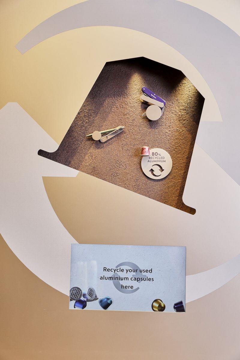 พร้อมปิดท้ายด้วยการเดินชม ไฮไลท์สำคัญคือ จุด Recycling Corner ซึ่งลูกค้าสามารถนำแคปซูลที่ใช้แล้วมาคืนที่บูติก เพื่อให้เนสเพรสโซนำไปรีไซเคิลต่อ โดยในจุดนี้ยังมีภาพที่บอกเล่าเรื่องราวการเดินทางของกาแฟแคปซูลของเนสเพรสโซ (Recycling journey) อีกด้วย นอกจากนี้ภายในบูติกยังมีบริเวณพื้นที่สีเขียว ไม่ว่าจะเป็นต้นไม้ที่ตั้งอยู่บริเวณหน้าร้าน นั่นคือ ต้นกาแฟอาราบิก้า อีกทั้ง ยังมีภาพชาวไร่กาแฟที่เนสเพรสโซได้ร่วมมือกันสร้างสรรค์กาแฟที่มีคุณภาพ พร้อมทั้งยกระดับคุณภาพชีวิตให้ยั่งยืนยิ่งขึ้นผ่านโครงการ Nespresso AAA Sustainable Quality™