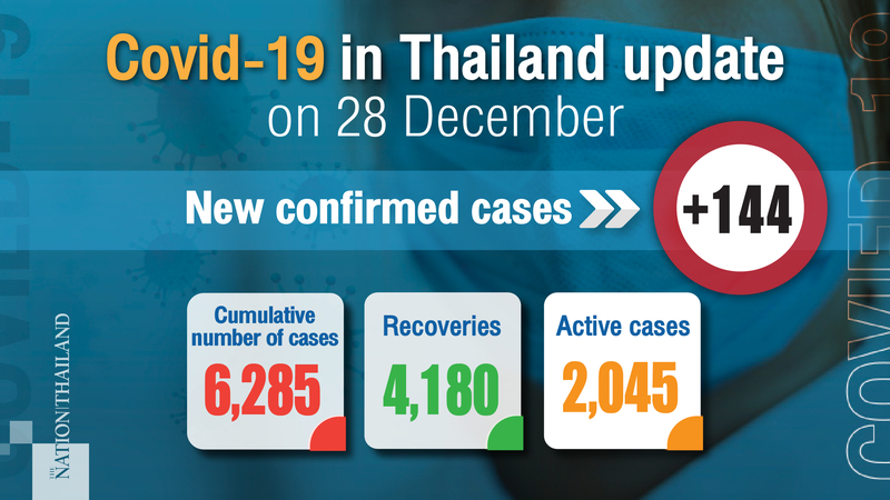 There were 144 new Covid-19 patients, including 115 domestic cases, over a 24-hour period on Monday, the Centre for Covid-19 Situation Administration (CCSA) said.