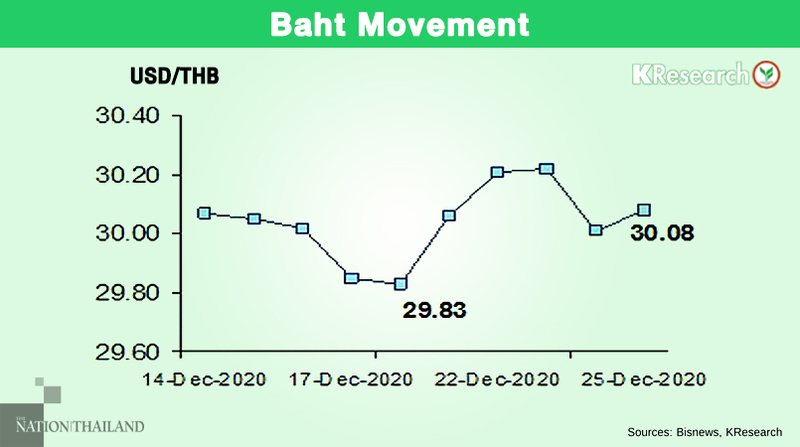 Between December 28 and January 1, Kasikornbank expects the baht to move within the range of Bt29.80 and Bt30.30 against the US dollar.