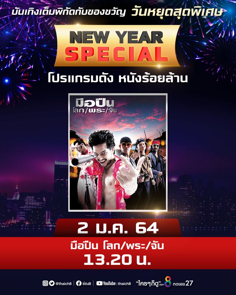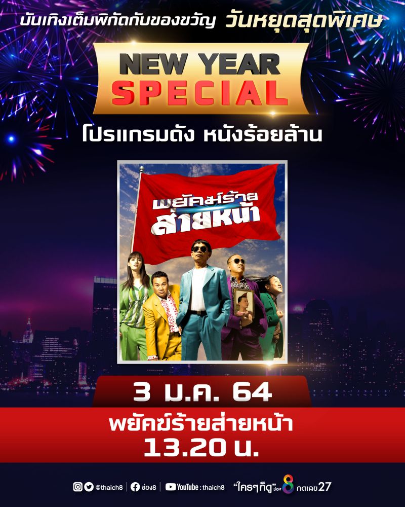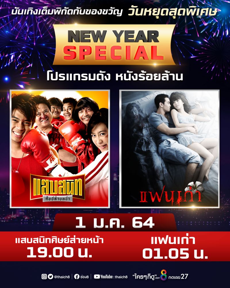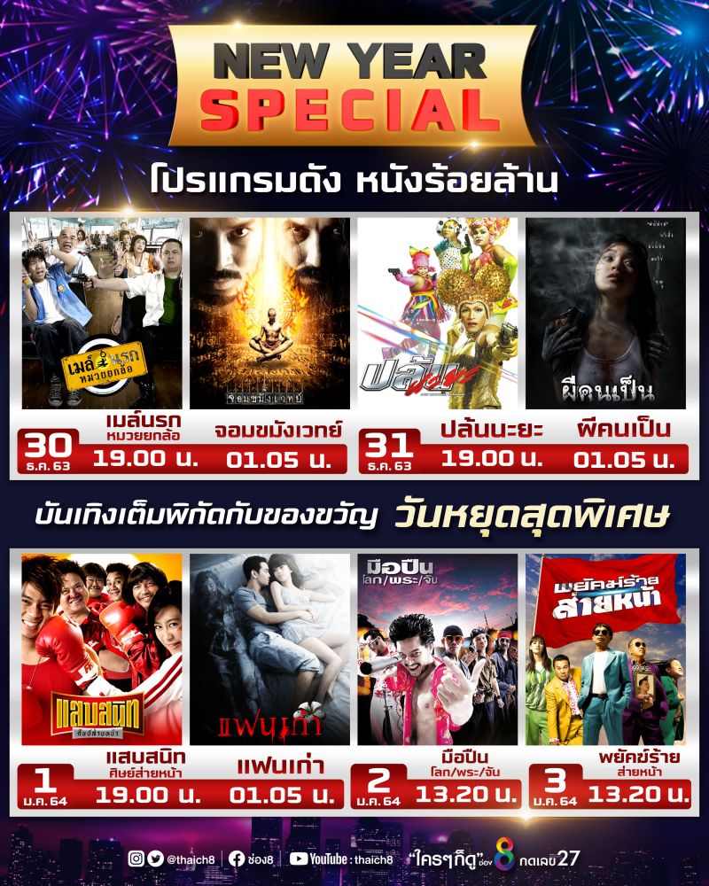 ต่อกันที่ วันที่ 1 มกราคม 2564 ต้อนรับศักราชใหม่ด้วยภาพยนตร์ฮาอารมณ์ดี “แสบสนิท ศิษย์ส่ายหน้า” เวลา19.00 น. นำแสดงโดย วรเวช ดานุวงศ์, ณัฐฐาวีรนุช ทองมี, โก๊ะตี๋ อารามบอย, จิ้ม ชวนชื่น, ค่อม ชวนชื่น ตกดึกมาสยองขวัญกันต่อกับภาพยนตร์ แนวโรแมรติกสยองขวัญเรื่อง “แฟนเก่า” เวลา 01.05 น. นำแสดงโดย ชาคริต แย้มนาม, วนิดา เติมธนาภรณ์, นวดี โมกขะเวสต่อกันที่วันที่ 2 มกราคม 2564 กับภาพยนตร์เรื่อง “มือปืนโลก/พระ/จัน”เวลา13.20 น. นำแสดงโดยสมชาย เข็มกลัด, เทพ โพธิ์งาม, หม่ำ จ๊กมก, ถั่วแระ เชิญยิ้ม และ เท่ง เถิดเทิงปิดท้ายความฟินในวันที่ 3 มกราคม 2564กับภาพยนตร์เรื่อง “พยัคฆ์ร้ายส่ายหน้า” เวลา 13.20 น. นำแสดงโดย เทพ โพธิ์งาม, จิ้ม ชวนชื่น, ค่อม ชวนชื่น, จตุรงค์ ม๊กจ๊ก, ซาร่า มาลากุล เลน, จอย ชวนชื่น, โก๊ะตี๋ อารามบอย, น้องพี ม๊กจ๊ก, อุดม ชวนชื่นหากใครไม่มีโปรแกรมไปท่องเที่ยวที่ไหนก็เตรียมกดรีโมทรอที่หน้าจอ ช่อง 8 กดเลข 27 ไว้ได้เลยจ้า