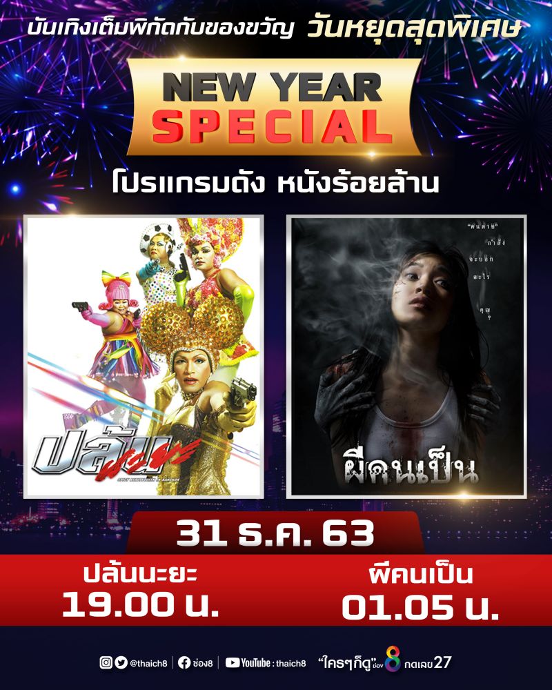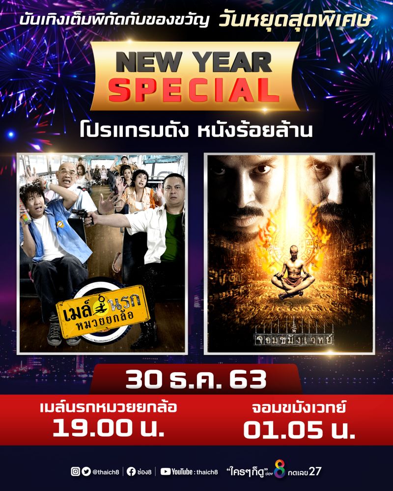 สถานีโทรทัศน์ช่อง 8 เอาใจคอหนัง บันเทิงเต็มพิกัด กับของขวัญวันหยุดสุดฟิน ด้วยการ ส่งโปรแกรมดังหนังร้อยล้าน ให้รับชมกันแบบยาว ๆ กันแบบคืนข้ามปีเริ่มด้วย วันที่ 30 ธันวาคม กับภาพยนตร์เรื่อง “เมล์นรก หมวยยกล้อ” เวลา 19.00 น. นำแสดงโดย อุดม แต้พานิช, สุเทพ โพธิ์งาม, เกียรติ กิจเจริญ, อริศรา วงษ์ชาลี, เนาวรัตน์ ยุกตะนันท์, ศรีพรรณ ชื่นชมบูรณ์, อชิตะ ธนาศาสตนันท์, ธีระธร สิริพันธุ์วราภรณ์, คมสัน นันทจิต, พิมพ์ชนก พลบูรณ์และ เรื่อง“จอมขมังเวทย์” เวลา 01.05 น. นำแสดงโดยฉัตรชัย เปล่งพานิช, อัครา อมาตยกุล, ทอม ดันดี, ณัฐวุธ เอื้อมพรวนิช, สมพงษ์ ทวี, ประสาท ทองอร่าม, อโนชา กุลวงศ์, วรสิทธิ์ ชีพสาธิต ต่อที่ วันที่ 31 ธันวาคมกับภาพยนตร์เรื่อง คอมเมดี้อารมณ์ดี “ปล้นนะยะ” เวลา 19.00 น. นำแสดงโดย รัฐภูมิ โตคงทรัพย์, วินัย ไกรบุตร, จตุรงค์ มกจ๊ก, ธงธง มกจ๊ก, โก๊ะตี๋ อารามบอยและตกดึกกับภาพยนตร์สยองขวัญเรื่อง “ผีคนเป็น” เวลา 01.05 น. นำแสดงโดย พิชญ์นาฎ สาขากร, อาภาศิริ นิติพน, เพ็ญพักตร์ ศิริกุล, โชคชัย เจริญสุข